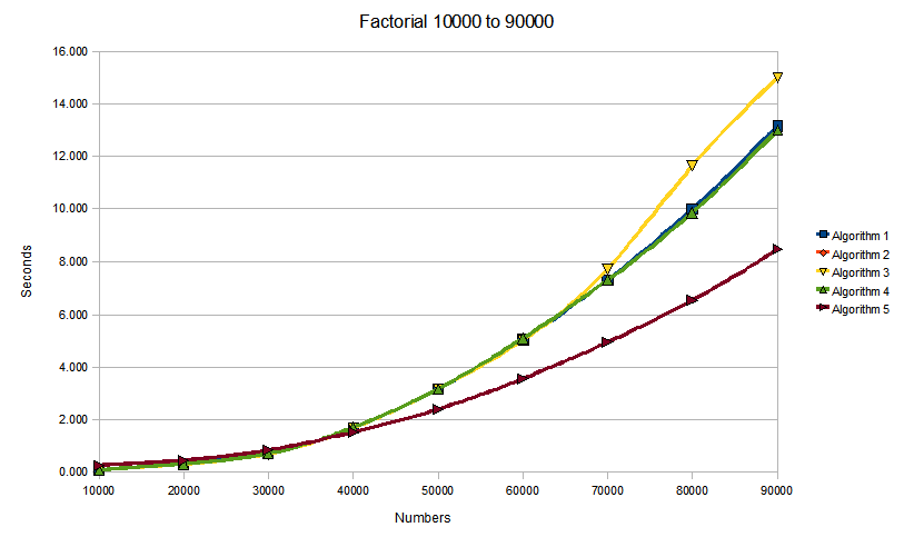 နောက်တစ်ြကိမ် စမ်းသပ်တဲ့အနေနဲ့ ၁၀၀၀၀ ကနေ ၉၀၀၀၀ အထိကိန်းတွေကို တစ်ခေါက်တွက်ချက်ပြီး ကြာချိန်တွေကိုပြန်ပြီး တိုင်းတာကြည့်ပါတယ်။ ဒီအချိန်မှာတော့ ရလဒ်တွေဟာ ပထမတိုင်းတာချက်နဲ့ ကွဲပြားသွားပါတယ်။ ပထမတိုင်းတာချက်မှာ အနှေးဆုံးဖြစ်တဲ့ Algorithm 5 ဟာကိန်းဂဏန်းကြီးလာတာနဲ့အမျှ အခြားသော Algorithm တွေထက် ကြာချိန်သိသိသာသာ လျော့နည်းသွားတာ တွေ့ရပါတယ်။ ပထမအကြိမ်မှာ ကြာချိန်အနည်းဆုံးဖြစ်တဲ့ Algorithm 3 ဟာ ကိန်းဂဏန်းကြီးလာတာနဲ့အမျှ ကြာမြင့်ချိန်အများဆုံး Algorithm ဖြစ်လာပါတယ်။ Algorithm 1 and Algorithm 4 ကတော့ ပထမတိုင်းတာချက်အတိုင်းပဲ ကွာခြားချက်သိပ်များပဲ တူညီသလောက်ရှိပါတယ်။ ဒီတစ်ြကိမ်မှာတော့ Algorithm 2 ဟာ Stack Space မလုံလောက်တဲ့အတွက် တွက်ချက်ခြင်း မပြုနိုင်တော့ပါဘူး။