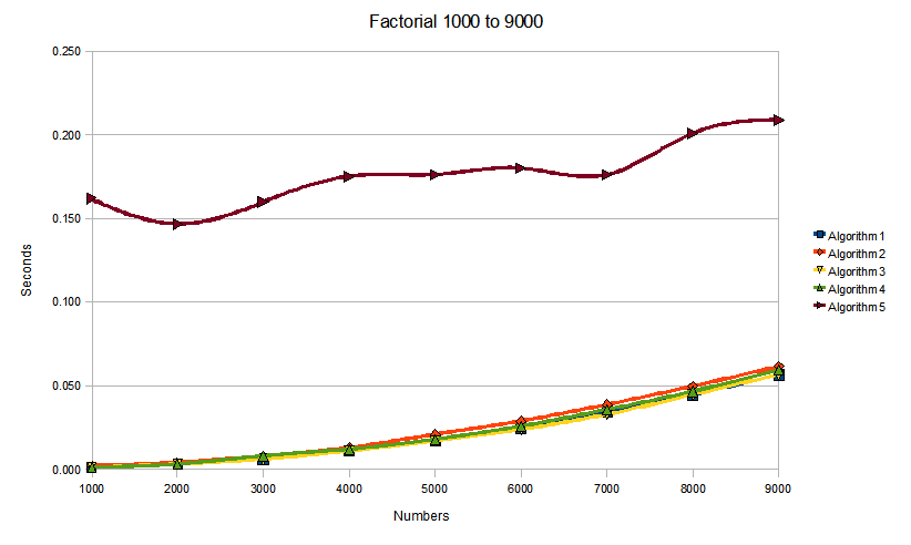 Algorithm ငါးခုလုံးဟာ ပုံမှန်အားဖြင့် ကောင်းကောင်းအလုပ်လုပ်ပါတယ် ကိန်းဂဏန်းသေးရင် တွက်ချက်ချိန်ကို မှန်းလို့မရပါဘူး အဲဒါကြောင့် ၁၀၀၀ ကနေ ၉၀၀၀ အထိကိန်းဂဏန်းတွေကို Algorithm တစ်ခုစီနဲ့တွက်ချက်ပြီး ကြာချိန်ကိုတိုင်းတာလိုက်ပါတယ်။ အဖြေတွေကိုကြည့်လိုက်တော့ ခက်ခက်ခဲခဲရေးထားတဲ့ Algorithm 5 ဟာအကြာဆုံးဖြစ်နေပြီး Recursive သုံးထားတဲ့ Algorithm 2 ဟာဒုတိယ အနှေးဆုံးဖြစ်ပါတယ်။ Built-in Function ကိုယူသုံးထားတဲ့ Algorithm 3 ဟာအမြန်ဆုံးဖြစ်နေပြီး Algorithm 1 and Algorithm 4 ကတော့ တူညီသလောက်ဖြစ်ပါတယ်။